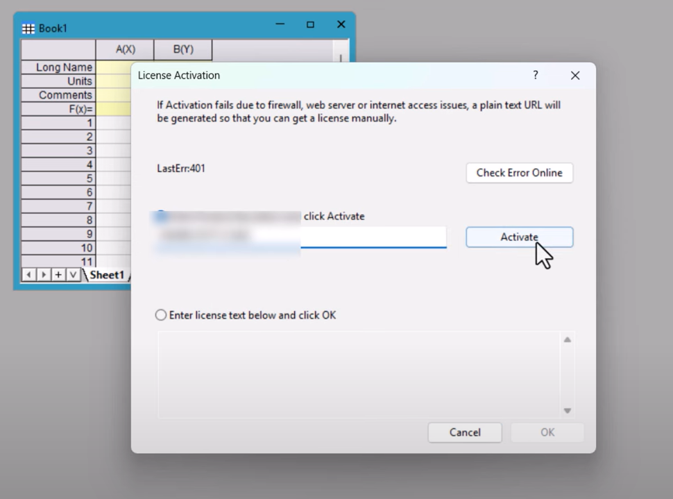 Copy and paste the activation key from your email into the activation field. Once submitted, OriginPro will verify the license online.