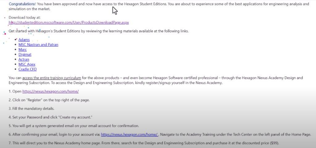 Hexagon typically sends an approval email within a few minutes, but depending on the time of day it may take a couple of hours. The email confirms that your account has been verified and that you now have access to the student edition downloads. Only after this approval will the download links on the student portal become active. MSC Patran Nastran 2025 Installation